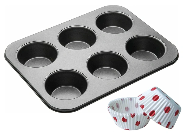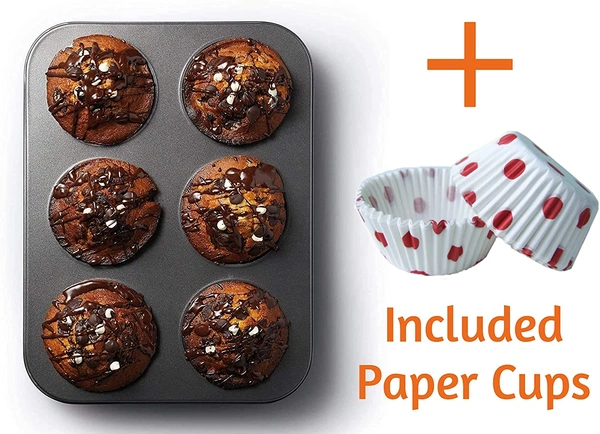 Carbon Steel Cup Cake Tray for 6 Muffins Bakeware | Non-Stick Muffin Tray (Black) (With Free Muffin Liners)